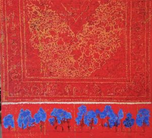 G R Iranna, Carpet as a Witness, 69×70 inches, Paper, Water Colour and Weaved Carpet, 2016