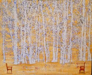 G R Iranna, Carpet shadow on trees, 5×5.5 feet, Acrylic on tarpaulin, 2017