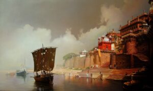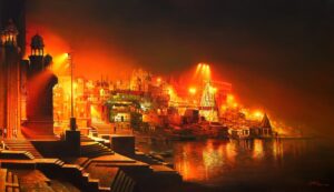 Amit Bhar,Night Banaras Ghat, Acrylic & Oil on canvas, 42 x72 Inches, 2016