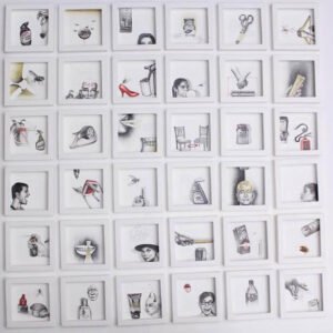 Sahil Jain, Black truths and Golden Lies, Coloured pencil and graphite on paper, s, 6 x6 inch each (set of 48 frames), 2016