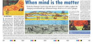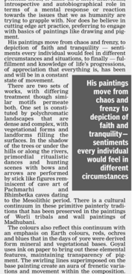 The comparative youth of the artist, all the more contributes to the energised nature of his visual languages. His exploration of a kinetic territory is courageous and it has certainly yielded authentic results, which even as they offer us the necessary jolt, extend the duration of the missing mind. He makes no standard or merely good gallery art. Along with a few others of his craft companions, he carries the living ghost of life right into the brood daylight of the present rather dry, desiccated times, thus enriching our kitty of the creative imagination.