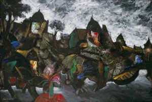 Polemics have always intrigued Manu Parekh – the energy of the organic form and the inherent sexuality within these forms are intangible elements in his works. His paintings provoke viewers to take notice of the world around them through the emotion, pain and anguish expressed in the subjects of his paintings. His colors and forms exude a volatile energy that can barely be contained within the confines of his canvas, and become an extension of the artist’s personality.