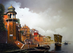Bhar chooses the realistic mode for his artistic expression – a made that is at once, penetrative, insightful and striking. The artist sees and perceives all things made by man and nature with all the care and grace they deserve. His paintings are filled with hues that not only please the eye, but go beyond. Bhar’s skill lies not only in mixing colours, perfecting the line and forming a texture. It is in capturing the nuance of a magical moment, a silent chant, a personalized mantra. Light is his biggest source of stimulation; the shadow, a willing and worthy companion. As he travels, explores, tests, compares notes, and unravels his mystifying narratives, Bhar is able to transform the truth of his experience in to an endearing visual landscape. Monks, deities, bathers, children – all of them are not mere excuses but intrinsically linked to the whole creative process and outcome. Their relationship with the external world and internal stirring is what gives them the reason to exist and celebrate their living condition.