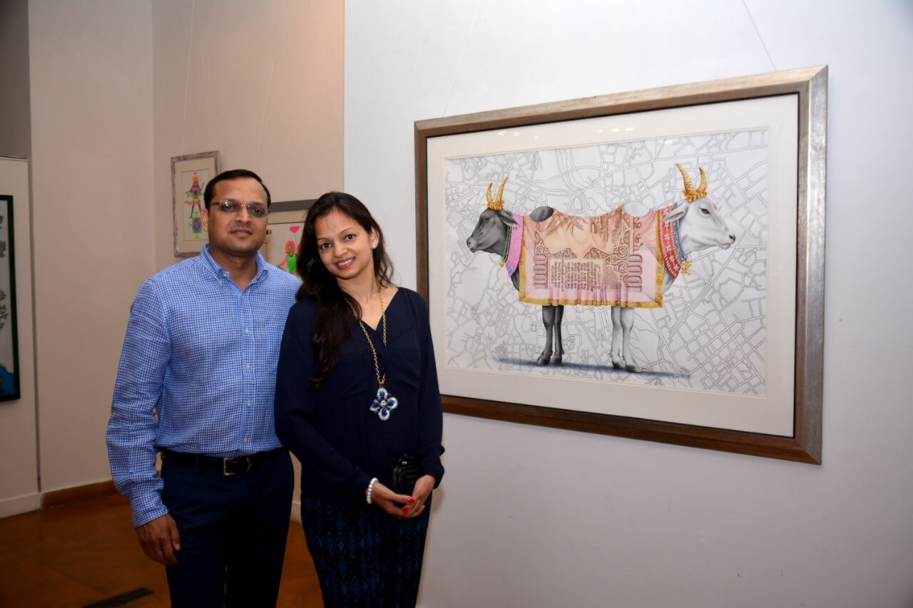 Works from Suchit Sahni, Rohit Sharma and Jagadish Chinthala inspire from the urbane environment and the vibrant colours they use add to the quirkiness of their subject. Juxtaposed next to these are spontaneous pen and ink doodles by Dhanur Goyal whose experimental style creates layered subjects and great textures.