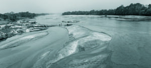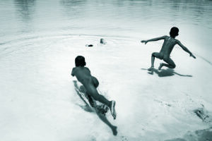 The intense revisiting enabled the photographer to record both the history and the present moment creating in the process an archive that was invaluable. In the suite of photographs these testimonials come alive in the photographer’s vivid compositions. The temples dating back to medieval ages have stood the test of time and despite the patina of years appear regal and stately with the designs mostly intact on the ceilings and walls. Around these structures, life goes on and we find a parallel world existing alongside. Right next to the intricately patterned ‘mandir dalaan’, clothes hang out to dry and village boys jump into the nearby pond to cool off on a hot summer afternoon. Kirtaniyas strike up a bhajan tune on their harmonium and in the twilight hour the elders gather around to hear and sing along with the musicians. Sanjay has now befriended many of them and is allowed to shoot these moments and even more intimate scenes when the boatman who ferries him invites him to take pictures of his wife Najma, as she sits stitching a ‘Kantha’ with her group of friends. I am struck by her luminous eyes as she looks into the camera, completely at ease with the city man’s presence.