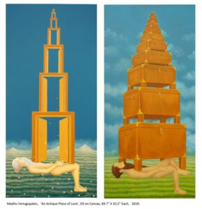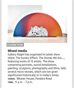 The works in the exhibition are such stories which might seem very ordinary and not given any significance historically or in our times today, it can be only kept aside not ignored. Some of these stories have gone missing or have been shelved into the shadows and the artists in the show are highlighting these stories from various contexts and backgrounds. Some of the works are rewriting these stories as the mise-en-scene of history. Works of Cathy Lane about the Ayahs’ who left India just before the Independence , Annu Palakunnathu Matthew shows us World War11 soldiers lost to history , farmers in Punjab by Thukral and Tagra, stories lost in the shadows by Iranna & Cristiana, or the messages hidden between the lines by Masooma , a portrait of the city by Vivek Villasini, Gigi Scaria as well as Pooja, lost faces in Kashmir by Veer, recall set by Riyaz, Jagannath and Madhu, employing fictional, anecdotal and the factual.